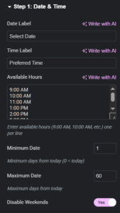 | Disable Weekends | Yes | No weekend bookings |