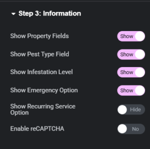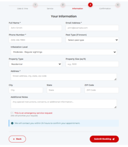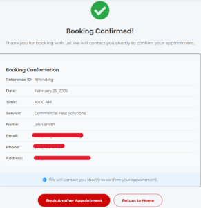 The Booking Form widget is a powerful, multi-step booking system designed specifically for pest control businesses. It allows customers to schedule appointments, select services, and submit their information seamlessly.